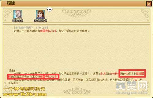 只要你请服务员喝一杯,多数情况下都可以得到有用的探险信息。不过要注意的是,你要先看一下自己手下的航海家是否满足探险的基本条件,不然探险的结果多是失败的。如果有满足条件的探险家,那你尽可以将他派出去探险。