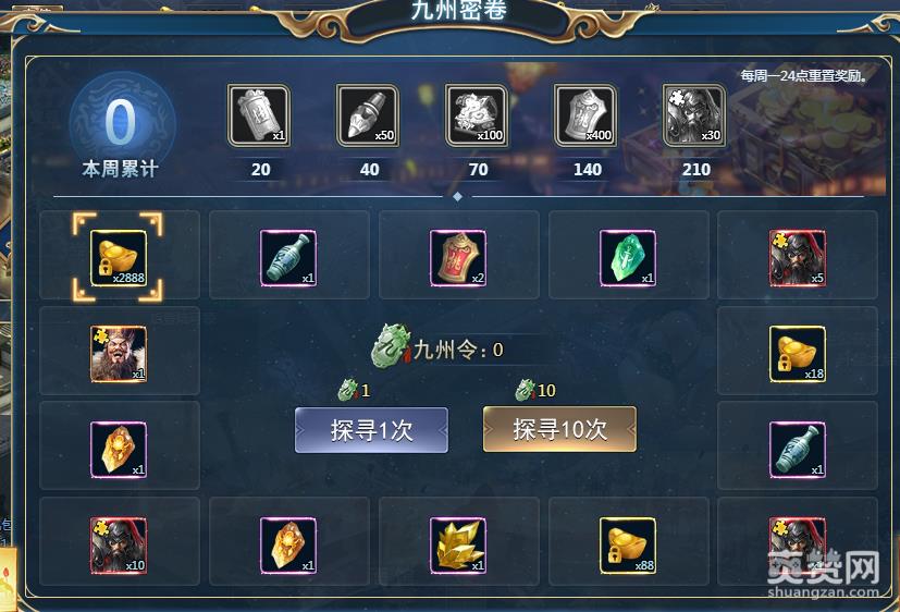 在真战三国九州密卷活动中,玩家可以通过使用九州令可进行探寻,探寻即可得奖励,一周内累计使用九州令,亦可获得奖励!活动时间永久。
