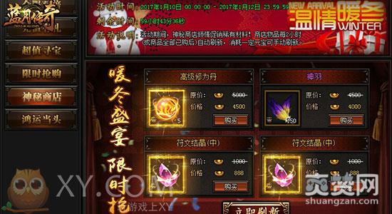 每到活动庆典,传说中的神秘商店都会打开,这一次也不例外。暖冬活动期间,XY游戏《蓝月传奇》神秘商店再次开启,各种稀有材料低价出售,全服飞升精品限时血拼。另外,要注意的是,神秘商店物品每2小时就会自动刷新,当然消耗一点元宝也可以立刻刷新满足你的需要。不过,作为超值商品自然数量有限,因此每件商品每次刷新只能购买一次哦!超值材料,等你来抢,心动不如行动!
