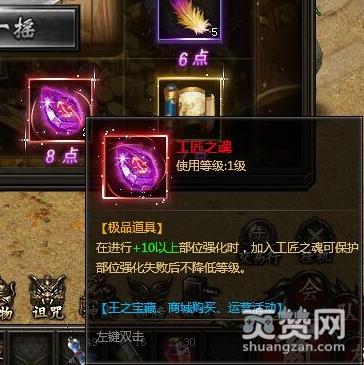 由于部位强化等级可达到+15级的,大家要想快速将全身装备,强化满+15级,那么就要多准备一些工匠之魂了。玩家要想获得这种道具的话,可通过王之宝藏挖宝有一定几率挖出该道具,或者进入商城里购买,甚至部分运营活动内容,也能获得一些工匠之魂的。