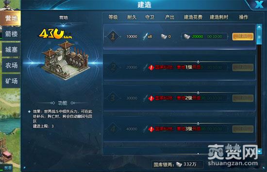 43u《真战三国》的建造系统可以查看本国城池占领情况,占领城池越多,可为国家提供税收银两就越多,用于在空地建造功能建筑。空地可建造5种功能建筑,包括营地、箭楼、城塞、农场、矿场: