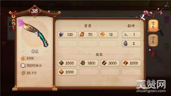 下一阶段的图纸跨度比较大,是38级的暗器黄泉,要知道在装备里暗器这一类是比较稀少的,但是通用性是配件里最广的,虽然价格方面值得诟病,但是黄泉则不一样,精通之后也能卖出接近百万的高价。配件为19级的暗器蓝色手戟,是同一系列的产物,不用顾虑原材料的生产问题。