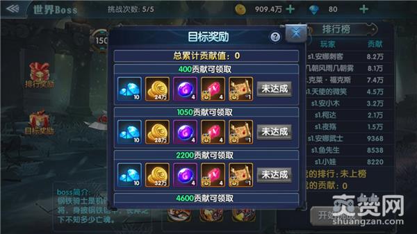 世界BOSS挑战玩法并不是单人作战,会在进入战斗时随机匹配队友,最大人数为10人,每场战斗的时限为5分钟并且不能携带战斗型宠物。战斗的奖励分配模式分为两种,一种是排行奖励,按照贡献量排名,贡献量越高排名越靠前,获得的奖励也越丰厚,另一种是目标奖励,获得对应的贡献指标,就会发放相应的物品奖励。