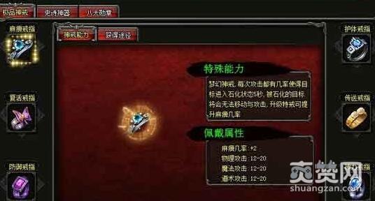 通过点击923yx《烈火2》主界面右上方的“天兵神器”按钮,即可进入“天兵神器”系统。天兵神器的极品神戒中共有六大戒指,这些戒指没有属性加成,不过却能带来逆天的特殊效果,比如原地复活、传送等,相信一定不会让大家失望!