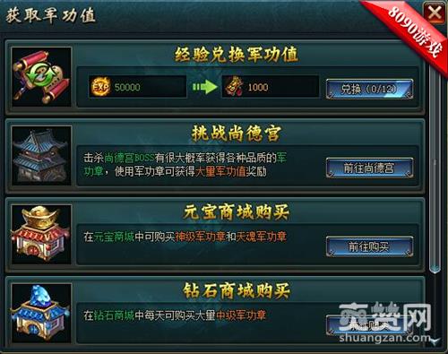 除了花钱购买军功值之外击杀尚德宫boss也是有很大的几率会获得各种品质的军功章哦,使用军功章就可以获得大量的军功值了呢,说到这里相信小伙伴们对于在8090君王之路中提升军衔有了更深的了解了吧!