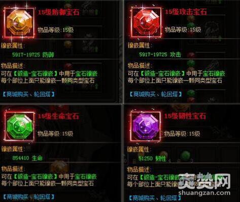 923yx《灭神》中的宝石共有四种颜色,分别是代表攻击、防御、生命以及特殊韧性的宝石,只要大家等级达到305级即可开启这些宝石。攻击、防御、生命宝石增加的属性与名称一致,韧性宝石则是抵抗暴击伤害,只要将宝石镶嵌在装备上即可获得附加属性。
