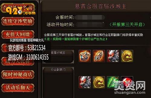 除了让人热血沸腾的竞技和排行外,923yx《烈火战神》中还有高额的充值奖励。在跨服大战期间充值达到3000元宝的勇士将可以获得麻痹戒指、8倍经验神符、英雄和金蚕王,若是名列前三甲的还能获得战神宝甲、战神腰带和战神靴子!