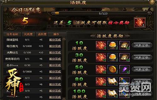 当玩家活跃度达到30分,可以领取到500元宝、3颗50万经验丹和3个副本卷轴;当玩家活跃度达到60分,可以领取到5个护盾碎片(小)、500元宝和5颗50万经验丹;当玩家活跃度达到90分,可以领取到500元宝、7颗50万经验丹和25000血继值;当玩家活跃度达到90分,可以领取到500元宝、20根羽毛和一个烟花。每日超多任务超多奖励。每日BOSS每日刷,各种副本不能落!萝卜玩《创世》等你来刷!