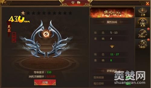 2、灵器:110级可激活,可增加角色攻击和精准;升级需要消耗灵器精华,主要通过逆魔古阵和每日目标获取。