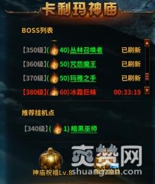 “卡利玛神庙”地图里面目前共10个领主怪,从270级到400级不等,在神庙中击杀领主和小怪会掉落天使装备以及天使粉尘,这是我们强化“天使装备”的必须材料。我们能在玩法界面看到对应的领主存活以及刷新情况。