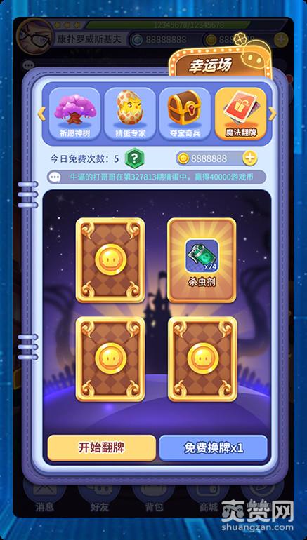 进入“魔法翻牌”后,会向您展示四张物品卡牌,您可以点击“换牌”并花费800游戏币重置四张物品卡牌,每位玩家每天有一次“免费换牌”的机会。