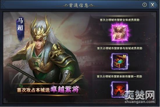 首通城池首次次被玩家国家攻下后,本国所有玩家即可领取该城的首通奖励,本国参与攻城的所有玩家可以额外获得参与攻城奖励,在本次攻城过程中伤害最高的玩家可额外获得丰厚的杀神奖励。