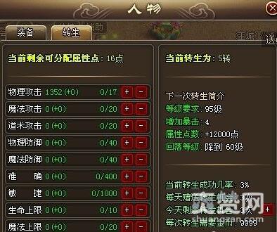 此外,若是有玩家想要同时提高生命上限和防御部分的,则建议大家在923yx《屠龙传说》中去乞灵装备。一般一转以上的装备,衣服乞灵得好的话,物防和魔防可以各加700以上,这可比加转生属性点高得多哦!