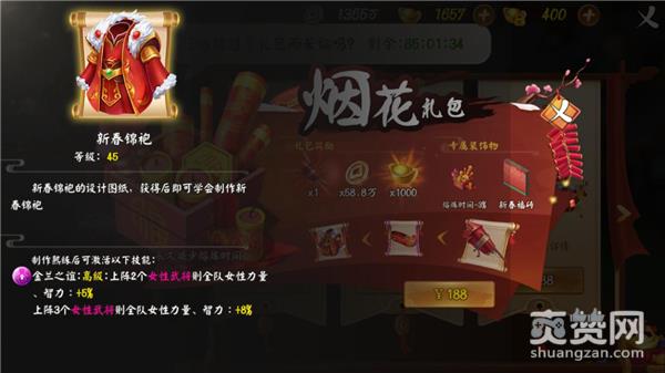 最后所说的烟花礼包,对于热爱战斗的玩家们来说是十分有吸引力的。其中的专属装饰物拥有使熔炼时间减少3%的效果,在一定程度上提高了玩家精品装备的产出概率。图纸方面,5级的新春烟花图纸售价在前期十分的高昂,不失为一件过渡的好装备。下一阶段的新春虎头鞋,虽然等级偏高,但在价格上相比刑天盾是毫不逊色,可以作为备选装备。最终的新春锦袍则是法修队伍最好的嫁衣,高额的属性加持,往往能让其以弱胜强,爆发出令人意想不到的威力。