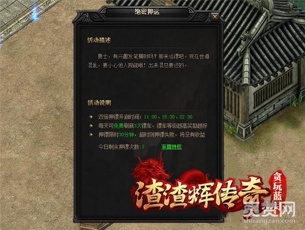 《渣渣辉传奇》押镖任务是一项日常任务,随时随地都能参加。不过双倍押镖却不是随时都会有的,时间就固定在每天的11:00-11:30、16:00-16:30、22:00-22:30。小编建议玩家在《渣渣辉传奇》双倍押镖活动时间之内,点击参加活动,到NPC处去接取镖车。同时刷新镖车至价值连城的五级镖车,护送镖车至目的地,即可获得绑金、经验和功勋值。绑金可用于购买药品、帮会捐献、培养英雄等,而功勋值能用于升级官阶,是《渣渣辉传奇》提升实力的一大重要途径。