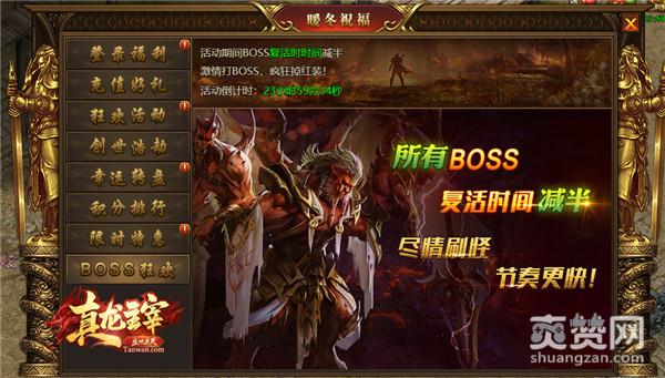 激情打boss,疯狂掉红装!活动期间BOSS复活时间减半(跨服BOSS除外),立即刷怪。