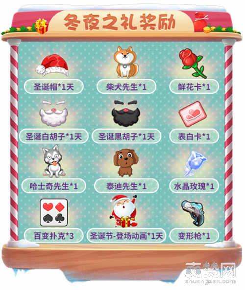 每局累计获得5份奖励:额外随机赠送一份:圣诞礼物、舞狮、爱吻卡