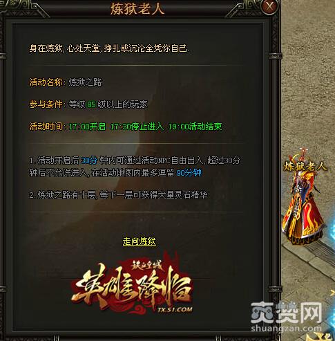 身在炼狱,心处天堂,挣扎或沉沦全凭你自己。51《铁血皇城》每天17:00炼狱之路便会打开,在铁血土城点击炼狱老人,即可自由进入,当然进去也是有一个小小的条件,就是等级要在85级以上,相信这对绝大多数玩家来说简直就是毫无难度,活动开启后30分钟内可通过活动NPC自由进入,超过30分钟后不允许进入,在活动地图内最多逗留90分钟。炼狱之路一共有十层,每下一层可获得大量灵石精华。
