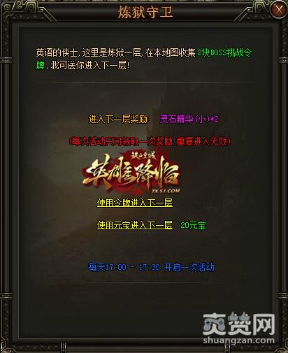 “英勇的侠士,这里是炼狱一层,在本地图收集2快BOSS挑战令牌,我可送你进入下一层!”这是来自51《铁血皇城》炼狱守卫的问候,炼狱之路的每一层都有一只boss,击杀有几率掉落高级装备,击杀小怪就可获得boss挑战令牌,当然土豪要是不屑于打小怪也可消耗元宝进入下一层,同时可获得一定数量的灵石精华奖励,层数越高需要的boss挑战令牌与元宝就越多,当然获得灵石也越多,boss携带的装备也更丰厚。