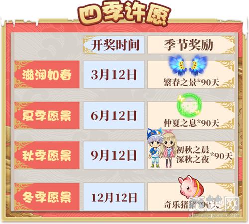 在2020年1月1日 - 2020年12月11日期间,选择任意季节的礼物并投入100金币就能进行许愿!之后每个季节都会随机抽取许愿该礼物的10名玩家送出对应奖励: