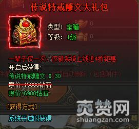 传说特戒雕纹升级:需要消耗传说雕文石,雕文升级后可以增加物理攻击、物理防御、最大生命和爆伤抵抗属性。传说雕文石可以通过活动产出。传说特戒雕文大礼包:传说特戒雕纹*30,原价:15888钻石,现价:6988钻石。