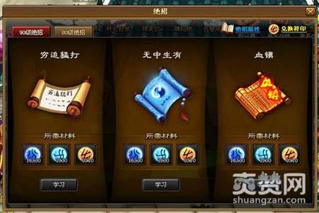 学技能需要获得符印,而符印可以扫荡指定的副本获得,也可以通过新版喜从天降系统获得的道具“仙令”兑换获得。80级绝招有强攻、排山倒海、回旋击。90级绝招有穷追猛打、无中生有、血镇。三个90级绝招学习所需材料为黄色符印X10、蓝色符印X30、青色符印X30。只要活得这些符印就可获得相应绝招。
