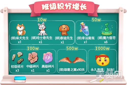 活动结束后,根据每个班级的游戏积分增长情况进行排名,为排名第一的班级中至少增长100游戏积分的玩家颁发奖励!