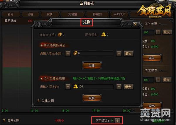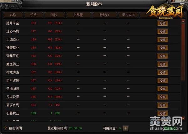 等级达到70级的玩家可点击按钮打开“蓝月股市”,股市开市交易时间为周一至周五,周五休市后可按接收盘价卖出,股票每天涨幅跌幅最多50%,点击“操作”按钮可对心仪的股票进行买卖。