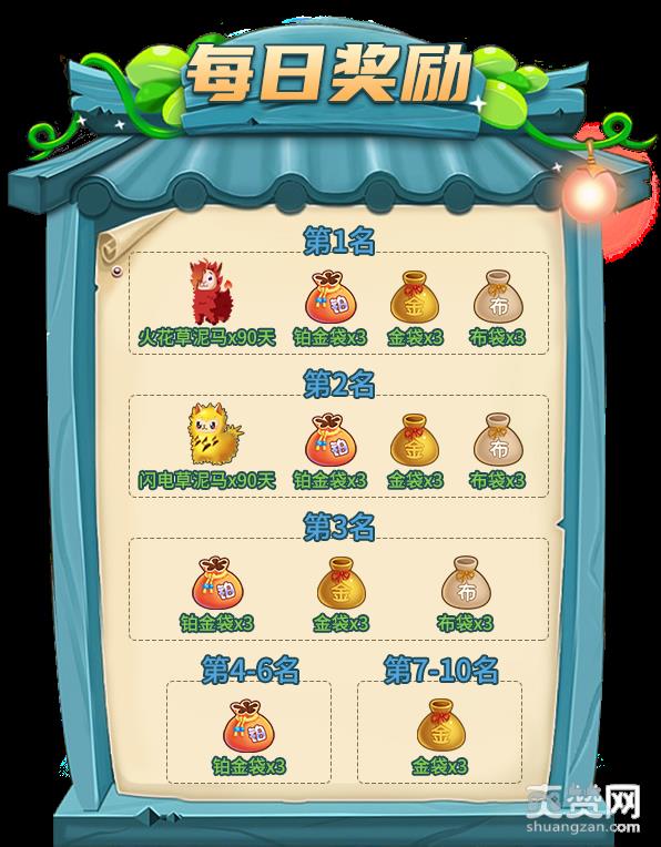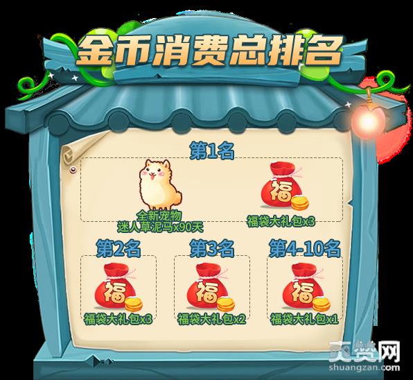 活动期间,开启春游狂欢购,全新宠物:“迷人草泥马”和多种大奖等你领取!金币消费数量越多,在“金币消费榜”上排名越高!每天00:00,系统会自动为前一天“金币消费榜”前十名玩家发放奖励!