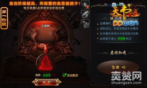 而血池在ppwan《天书世界》中则是通过消耗血菩提进阶血池。血池的阶级越高,所需要的血菩提就越少。当血槽满时,血池将提升至下一阶段,每天凌晨5点将清空该阶段的血槽。但是在ppwan《天书世界》中,血池一旦进阶成功,将直接增加玩家的生命属性,使玩家的生命更加强大!