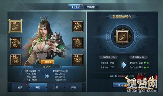3. 装备部位强化:装备共有6个部位,包括武器、护手、铠甲、头盔、腰带、战靴。在装备强化界面强化装备部位后,穿戴上装备将提供额外的属性加成。