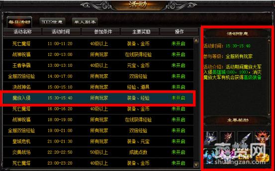 每天下午15:30-15:40魔族将会大举入侵,英雄们就可以拿起手中的武器守卫家园,击杀入侵怪物还有几率获得高级装备和海量经验。