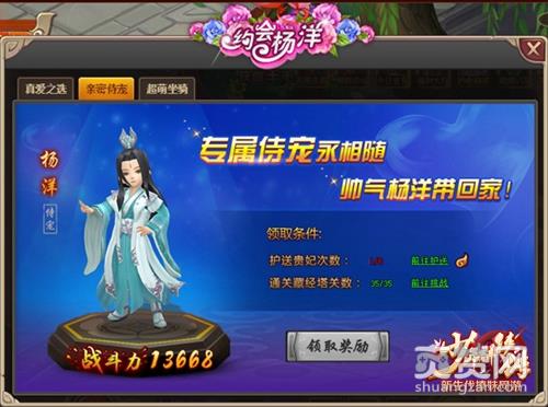 侍宠不仅是玩家闯荡江湖的亲密伙伴,更是玩家战斗PK时的最佳搭档。游戏中,杨洋将化身一袭青衣、气质儒雅的翩翩公子,并施展撩人天赋,帮你打怪战BOSS,伴你浪漫闯天涯。点击游戏主界面右上方的“约会杨洋”,完成护送贵妃和藏经塔过关任务,就能把男神领回家啦!