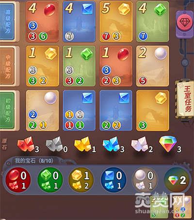 4)保留:将1张场上或左侧牌库中的配方牌提前保存在自己手上,并同时获得1枚彩钻,可在稍后的回合中合成。