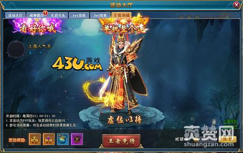 修仙道场积分排名前16位的玩家方可参与王者决战,赛事为随机1V1对战,分为16进8,8进4,4进2和决赛,产生冠军,获得称号和大量奖励。所有玩家可对所有赛事进行竞猜,活动结束后可获得竞猜奖励。竞猜支持率最高的人将被选为人气王,获得称号。
