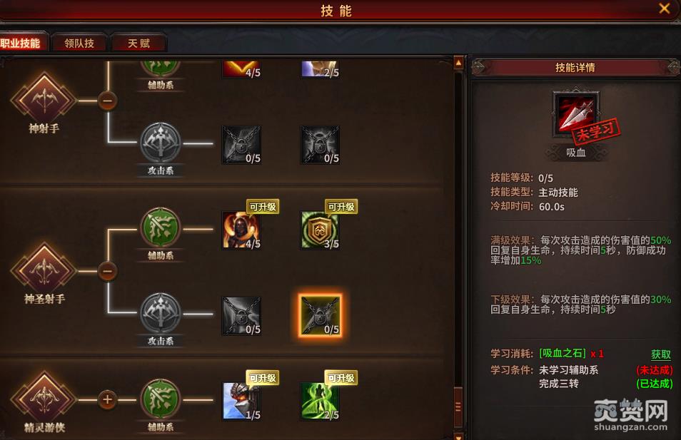 吸血——职业神技,PVE/PVP通用,攻击吸血,升级附加防御成功率BUFF
