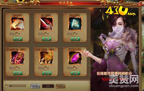 用时间兑换金钱,只要在线就可获得时间积分,在线的时间越长,可获得的积分也就越多。当玩家获得一定的时间积分,就可在时间商城中可兑换各种极品道具,时间商城中有三种商品,古阵秘典、名刀残刃和阵基原石。