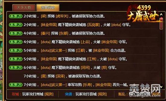 玩家可在当前页面查看“天下大势”和“世界历史”,当玩家加入势力后,即可参加征战。