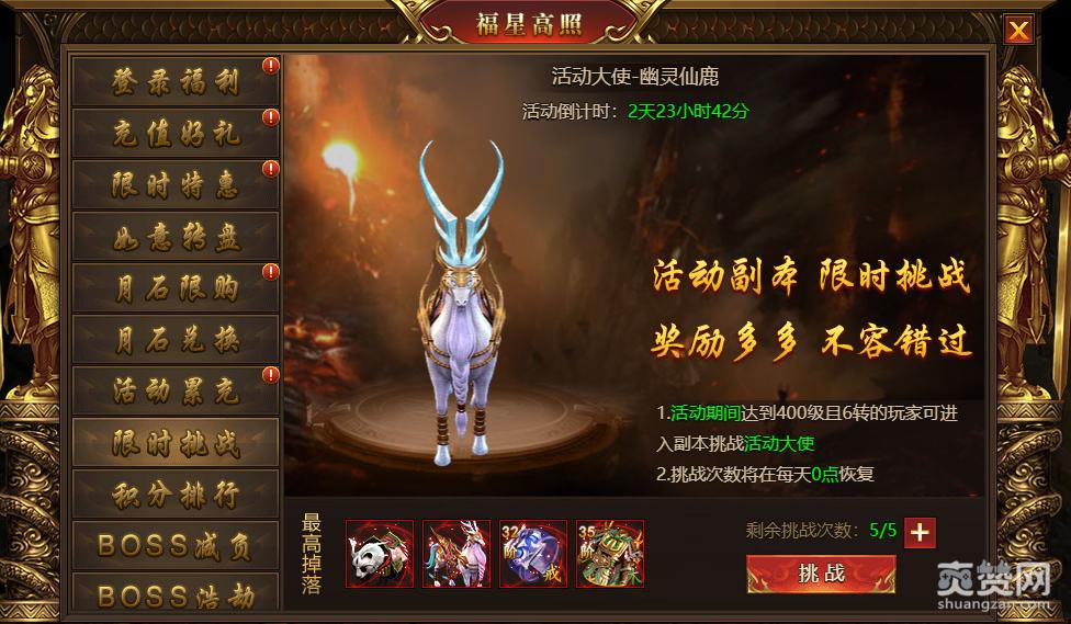活动期间达到400级且6转的玩家可进入副本挑战活动大使,每天可有5次挑战机会。限时挑战,奖励多多,不容错过!