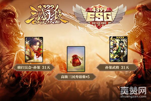 ESG决赛礼包:普通将印宝箱*2,高级三国秀锦囊*5,皮肤包*2,横扫吴会*孙策*31天,孙策武将*31天