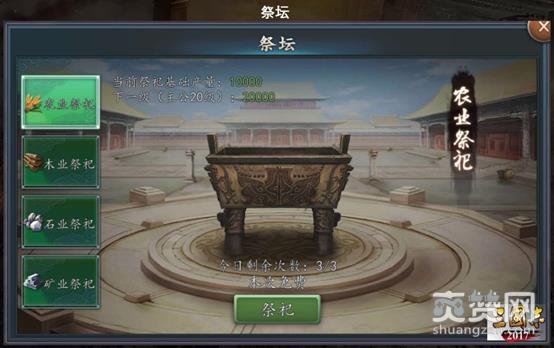 城池中有【农田】、【伐木场】、【冶炼厂】、【采石场】、【金矿】五种资源产出点,每种资源点可产出指定的资源,等级越高,产出越高,可解锁的资源点数量也得到提升,除此之外,城池内还有一个福利资源点,那就是祭坛,在祭坛中,玩家可以通过祈福获得除金矿外的四种资源,而且,四种资源的第一次祈福均为免费。每日按时收集和祭祀,可以累积不少的资源。