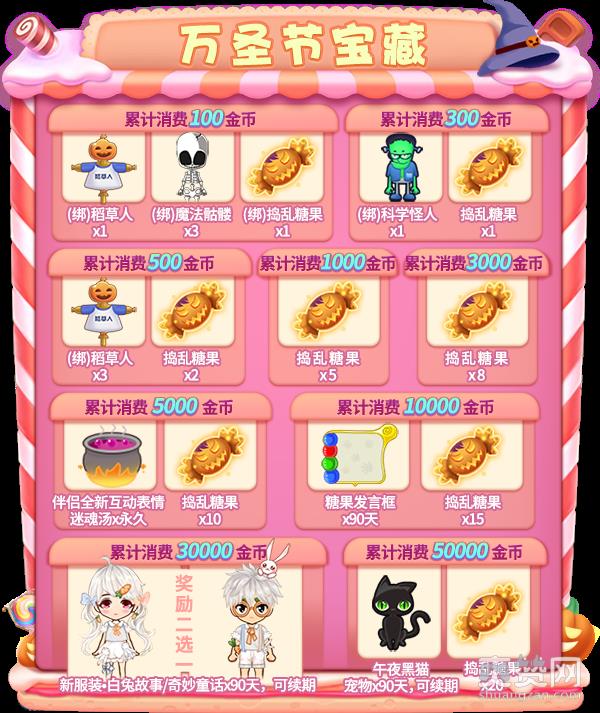 活动期间,累积消费金币达到相应条件后,就能领取“万圣节宝藏”!