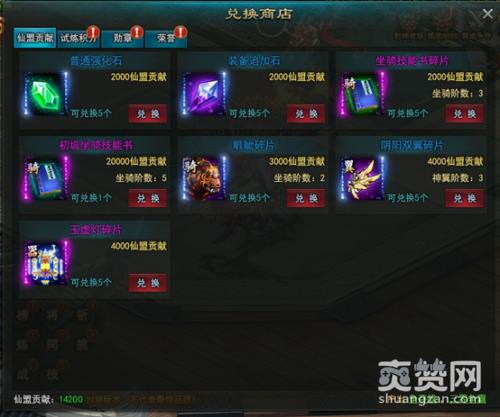 兑换系统是玩家通过仙盟贡献,试炼积分等货币进行兑换道具的功能系统。需要参与日常活动,仙盟活动和竞技场才能获得对应的货币资源。