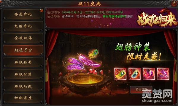 活动期间,不仅有轮回神装概率翻倍,更有翅膀神装限时抽取!兄弟们赶紧带上全新的翅膀,在天空中翱翔,共同庆祝狂欢吧。