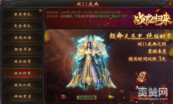 活动期间,玩家可在活动界面购买绝版时装“甄命天子甲”,使用后永久生效!代言人亲赐战甲,炫酷又精美,穿上它在战龙大陆上行走,不管走到哪里都是最靓的那个人。机会难得,这次错过,下次就不知道要等到什么时候 。