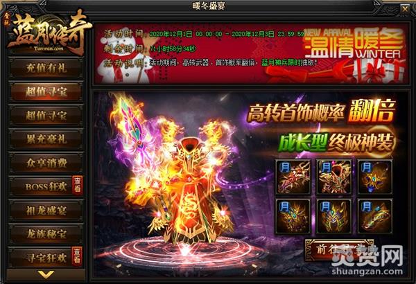 活动期间,不仅有高转武器、首饰概率翻倍,战神更是将蓝月神兵与八转符文放入奖池,限时抽取!一个是成长级的终极神装,一个是高转必备符文,不知道有哪些幸运的兄弟可以获得这两个法宝呢?