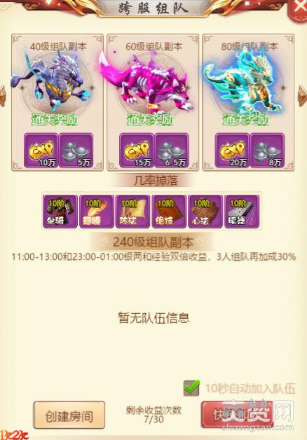 虽然跨服组队的重点是在获得高阶的材料,但每一次的银两、经验也是相当丰厚,更何况每日可以挑战30次,如果你想快速升级,还可以选择在每日的双倍收益时间内进行收取。