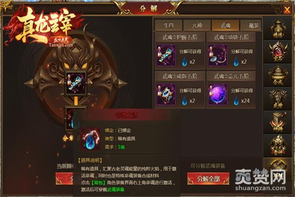 命魂是需要一定时间的沉淀后,才有资格拥有的。因此在《真龙主宰》中,开通命魂必须要等到开服75天后,并且想要激活命魂,还需要消耗命魂之源。在上期阴阳魂殿的介绍中,小编已经为大家透露过,击杀阴阳魂殿内的Boss将有概率掉落命魂之源,除此之外兄弟们还可以将自己手中多余没用的武魂装备分解,从而获得命魂之源。当集齐200个命魂之源后便能激活命魂系统,从而装备上武魂神装!