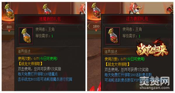 当玩家大师点当大师点数累计达到800时,可领取“猎魔激励礼包”。每天可免费打开领取120猎魔点,总共可获得7次奖励。击杀战龙boss后可消耗猎魔点进行挖掘,BOSS等级越高消耗点数越多,图鉴越稀有,获取特戒碎片概率越高。而当大师点数累计达到1800时,可领取“活力激励礼包”。每天免费打开可领取200活跃点数,一样可获得7次奖励。消耗活跃度可在VIP练功房享受15倍经验和掉率加成,但是活跃度将在每日0点清空,所以注意及时使用哦。