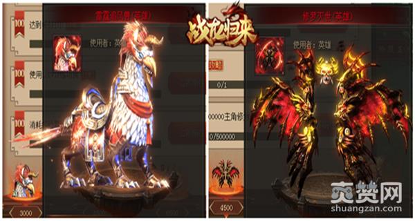 当大师点数累计达到3000时,便可领取超级炫酷的英雄坐骑——“雷霆追风兽”。雷霆追风兽可以提攻暴击加成并且有概率造成双倍猎魔伤害。而当大师点数累计达到4500时,便可领取超级华丽的英雄翅膀——“修罗灭世”。修罗灭世不仅能提供大量的切割伤害,更重要的是还能提供致命加成,如同名字一样是灭世之羽啊!